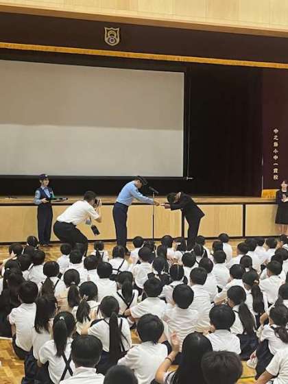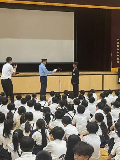 今朝は全校集会で天満警察署長にお越しいただき、本校児童による人命救助に対する署長表彰をしていただきました。