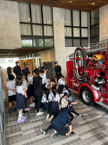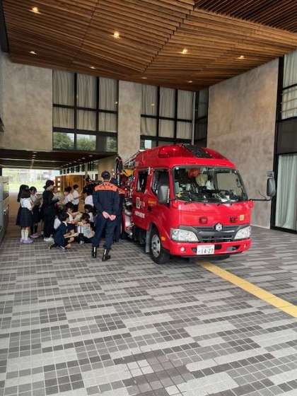 玄関には消防車が登場!消防車の仕組みや消防服を間近で見ることができました。