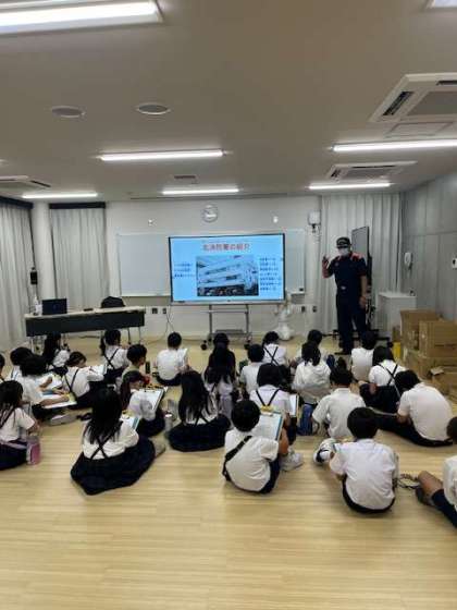 北消防署から隊員の方に来ていただき、消防署の仕事について話を聞きました。火事の火を消すだけではなく、人命救助や火災予防も大切な仕事だと学びました。