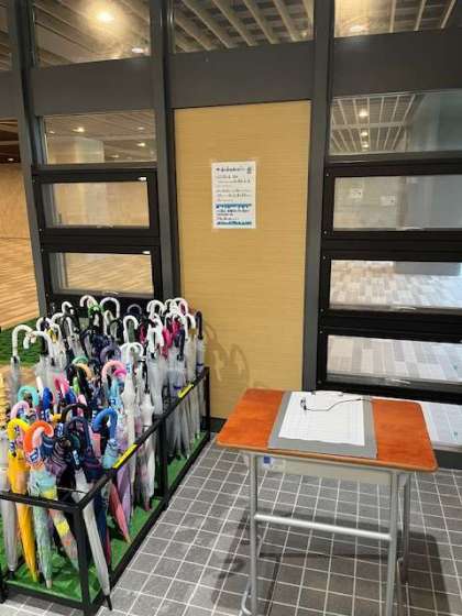 なかのしまLab.で集めていただいた傘を貸出用に設置したところ、たくさんの人が借りて帰っています。設置場所は下足コーナーの一番グラウンド寄りです。家で乾かしてから返却していただきますよう、よろしくお願いします。