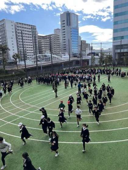 揺れが発生したらすぐに安全な姿勢をとり、おさまればすぐにグラウンドへ避難しました。引き続き、津波の恐れがあるので校舎3階以上へ避難を行いました。