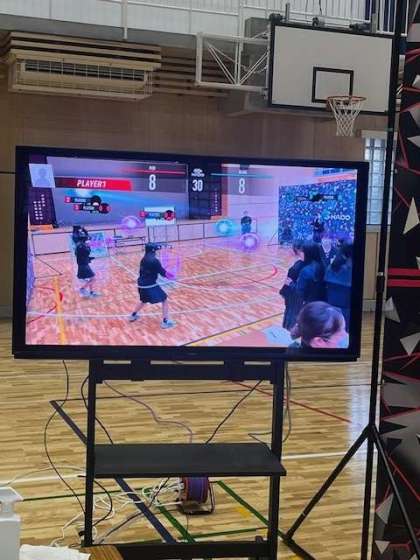 ゴーグルとアームセンサーを装着して、エナジーボールを打ち合いながらフィールドを移動し仲間の連携しながら対戦します。外から見ると何も分かりませんが、ゴーグル越しに見える景色は3枚目の写真の通り、没入感が半端ではありません。途中、先生チームとも対戦し大いに盛り上がりました。やはり、実際に体験し学び得ることに勝るものはないですね。