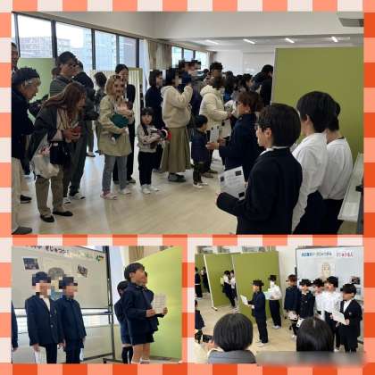 2年生は多目的室をブースで分け、コアプロジェクトでまとめた「中之島の名人」についてのプレゼンを行いました。子どもたちからは緊張感が漂ってきましたが、練習通りできました。
