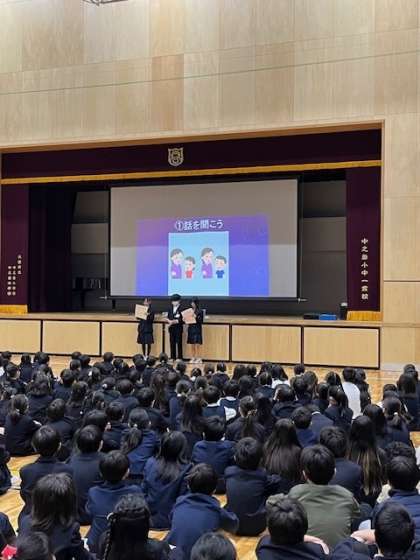 今朝の全校集会では表彰伝達や各種委員会・児童生徒会からの連絡がありました。