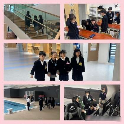 体育館で対面し、班に分かれます。この日のために1年生は担当の子の名札を手作りしていました。名札を左胸につけてあげて、学校見学がスタート。1年生はただ単に案内するだけでなく、安全に配慮しながら「ここは○○する場所」など上手に説明することができました。