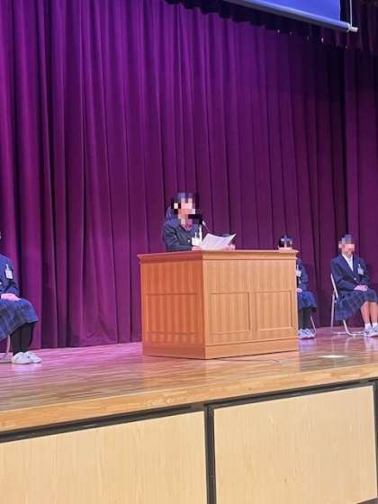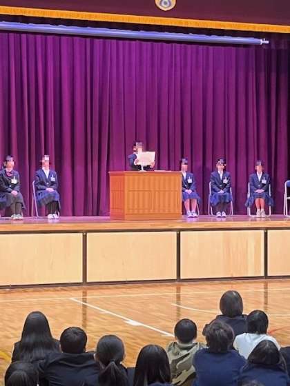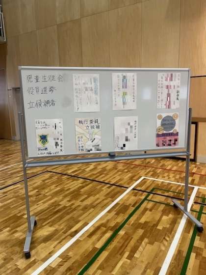 定数6に対して7人の立候補がありました。5〜8年生が見守る中の演説は、立候補者の思いがたくさん詰まったものでした。これまで取り組んできた小中交流の活性化はもちろんのこと、地域との交流、英語活動の促進など、新たなアイデアがたくさん出されました。
