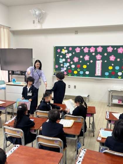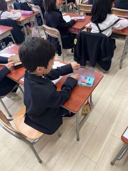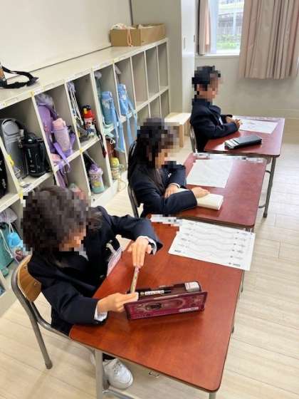 担任の先生から連絡帳を受け取り、ファイルに入れる、鉛筆を筆箱に片付け、机の端に置くなど、学習に入る前の基本的なことがらを確認しながら覚えていっています。