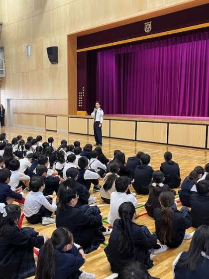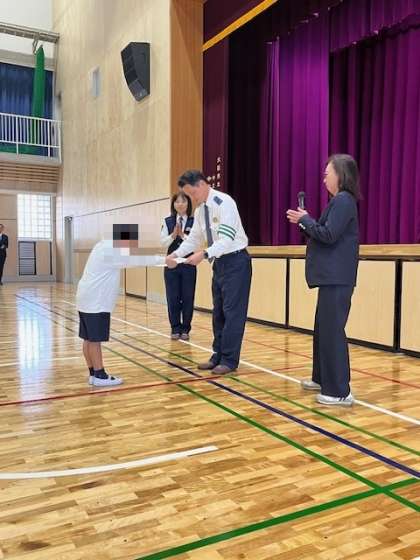 今日は交通安全に関する作文の表彰に天満署から2名来てくださいました。表彰の後のお話では、天満署管内で最近も人身事故が2件あったこと、小学生の事故の原因で一番多いのが飛び出しであることをお話しいただきました。