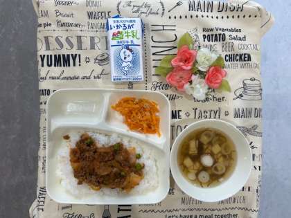 給食では、細切りにしたにんじん、ささみ、かつおぶしと調味料を混ぜ合わせ、焼き物機で焼きます。卵は使っていません。