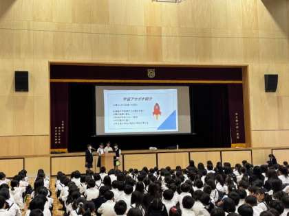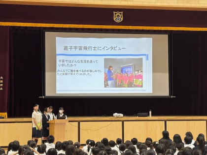 全校集会で、先日、万博で開催された発表会での様子について報告をしました。