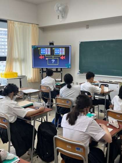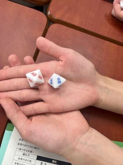 9年生理科 公開日 2025/07/03 更新日 2025/07/03 お知らせ 9年生は理科の授業で遺伝の規則性と遺伝子について学んでいます。 「特徴がちがう2種類の金魚から『目が赤く、つきでた』金魚が生まれる割合は?」 という探究課題に取り組みました。 正八面体のさいころを用いて、孫の代に現れる形質の比をシミュレーションしました。その結果は、仮説とほほ同じになりました。難しい内容ですが、生徒たちは積極的に取り組んでいました。 いいね(0)