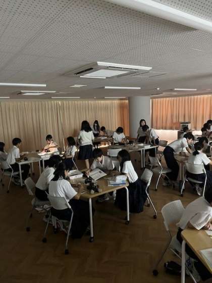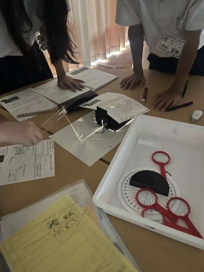 薄暗い部屋で・・・ 公開日 2025/07/09 更新日 2025/07/09 お知らせ 5階のパソコン教室2のカーテンがすべて閉められていました。中で何が行われていたかというと、7年生の理科の授業でした。 光の進み方を、各班ごとに実験、考察を行っていました。 本校理科室に空調設備がないため、夏場は室内でも熱中症の危険があります。そのため、同じ階のパソコン教室に移動し、機材も運んで授業を行いました。 いいね(0)