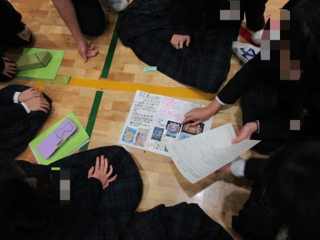 3年生が作成したポスターについて、7年生がアドバイスをし、より分かりやすいものになるように修正を加えます。