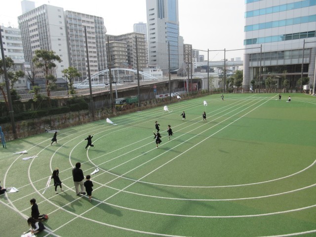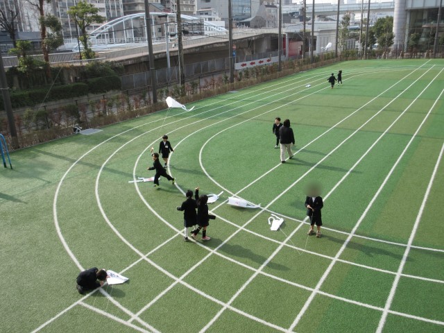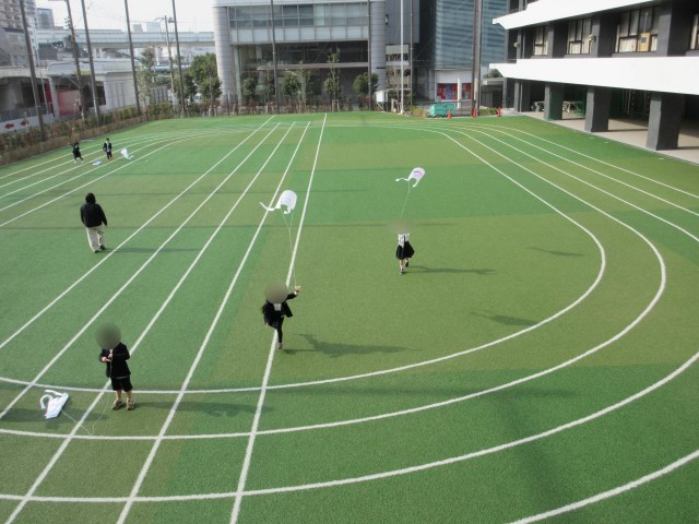 1年生が屋外グラウンドで凧揚げをしていました。