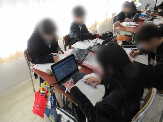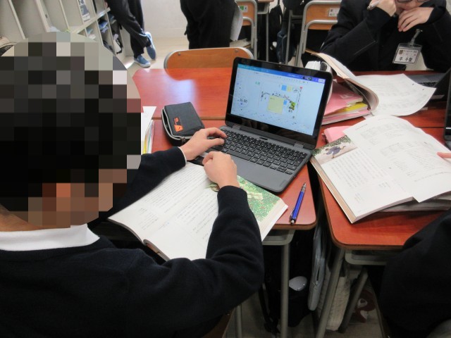 紙の教科書を広げながらデジタルで学びを共有する、まさにハイブリット型の授業です。