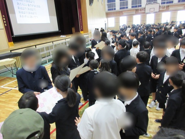 今日の1時間目、小学校集会で6年生を祝う会を実施しました。