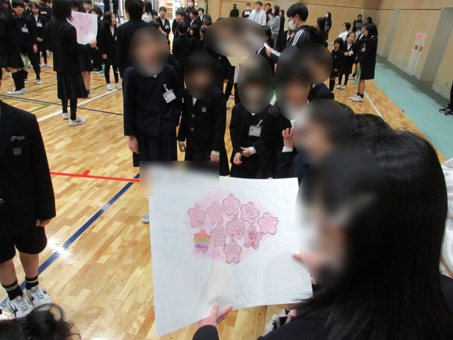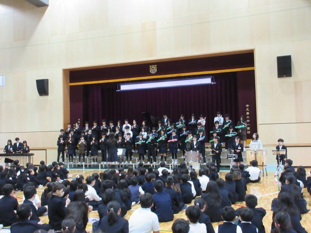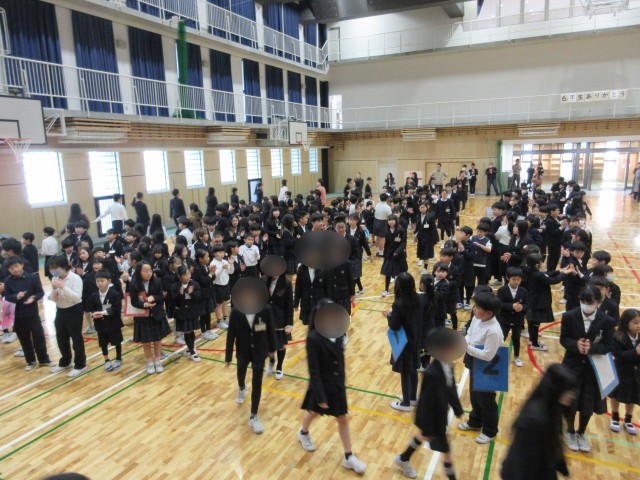 縦割り班でゲームをした後、在校生からは歌とメッセージカードのプレゼント、6年生かも合唱と合奏がありました。