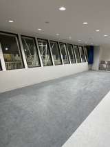 6階の屋内グランドが完成間近です。青色のゴムチップウレタンの上に、ドッジボールの...