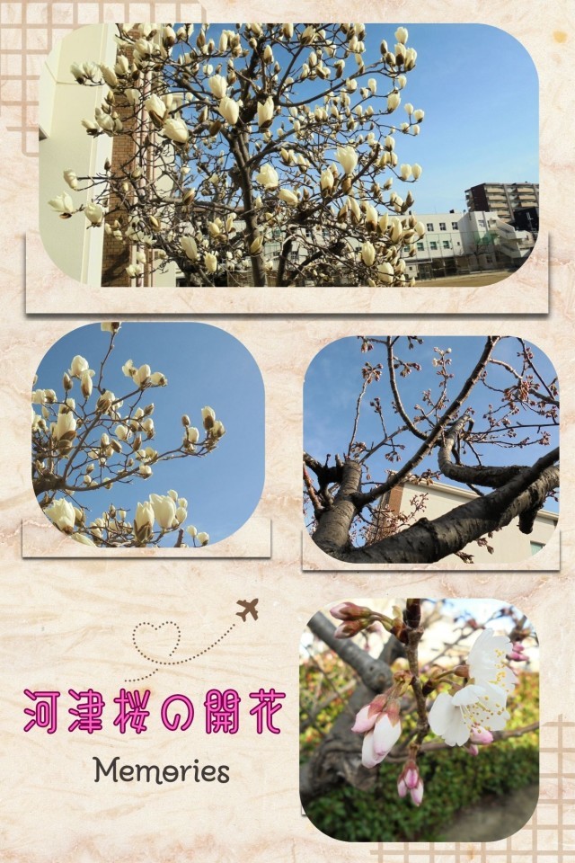 校庭の隅では、ハクモクレンが空に向かって真っ白な花びらを開き始めました。また、体育館前の桜も、よく見ると蕾の先がピンク色に色づいています。