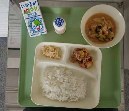 焼きとり、みそ汁、もやしのゆずの香あえ、発酵乳、ご飯、牛乳となっています。