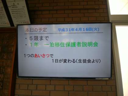 本日、放課後に1年生、一泊移住の保護者説明会を実施します。ご参加よろしくお願いいたします。