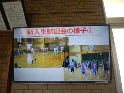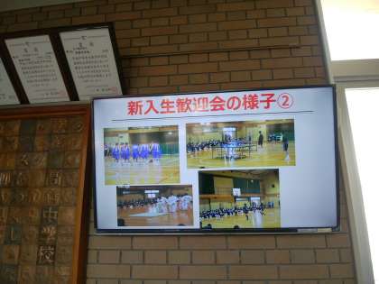 玄関ホールモニターでは、新入生歓迎会、部活動紹介の運動部の様子を紹介しています。