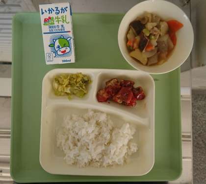 まぐろのオーロラ煮、じゃがいもと野菜の含め煮、キャベツの梅風味、ご飯、牛乳となっています。