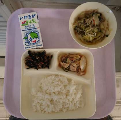 豚肉のごまだれ焼き、五目汁、ひじきのいため煮、ご飯、牛乳となっています。
