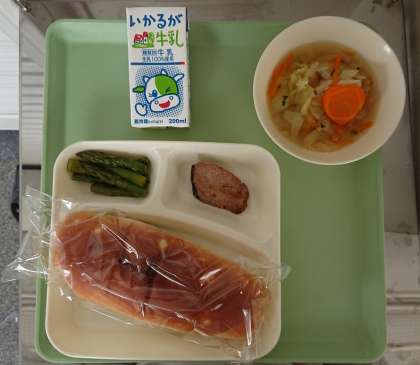 5月9日(木)給食献立 公開日 2019/05/09 更新日 2019/05/09 お知らせ かつおのガーリック焼き、鶏肉とじゃがいものスープ、おさつパン、グリーンアスパラガスのサラダ、牛乳となっています。 いいね(0)