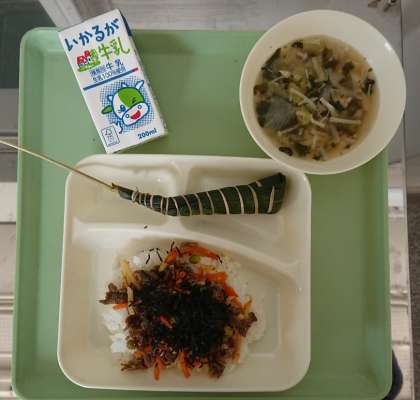 牛肉のちらしずし、すまし汁、ちまき、牛乳となっています。