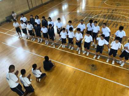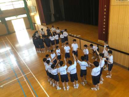 体育大会、応援合戦の練習の様子です。 応援リーダーが前へ出て、振り付けの伝達を行なっています。
