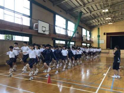 2年生、体育の様子です。 体育大会に向けて、入場行進の練習をしています。