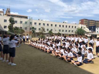 2.3年生は、3年生の応援リーダーの指示のもと、応援合戦の練習を行なっています。