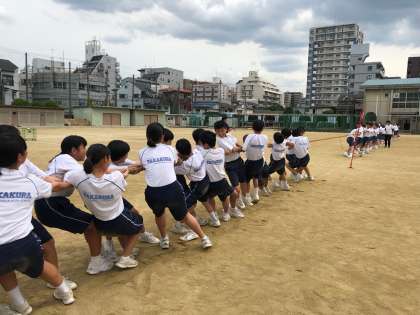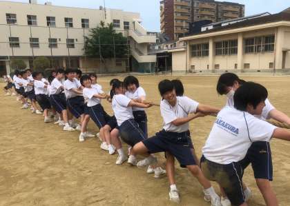 体育大会の学年種目、綱引きの練習をしています。 担任の先生と一緒に作戦を立て、練習から白熱しています!
