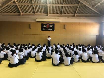 2年生、校外学習の出発式です。 班で協力をし、安全に充分に気をつけて、良い活動にしましょう。