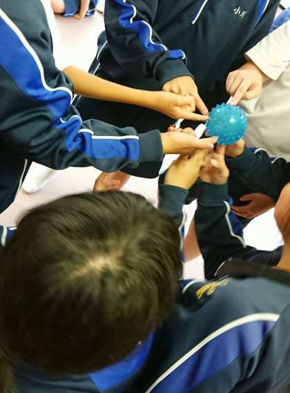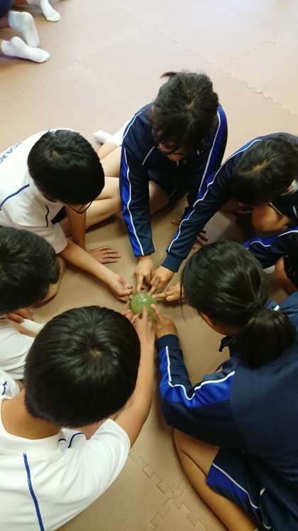 2組の様子です。 班で協力して、指一本でひとつのボールを持ち上げます。