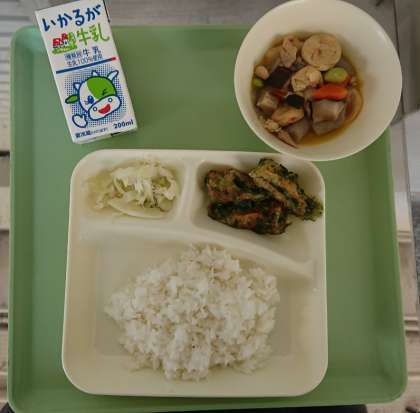 ちくわのいそべあげ、鶏肉と一口がんもの煮もの、あっさりキャベツ、ご飯、牛乳となっています。