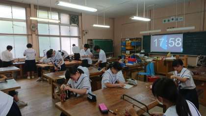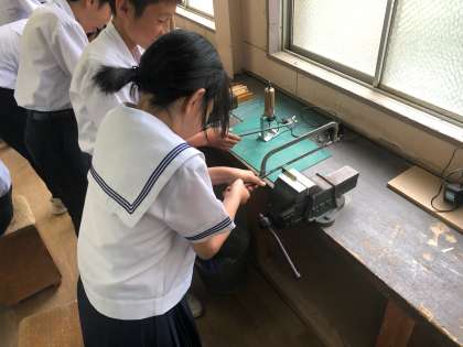 2年生、技術の授業の様子です。 金属加工で、キーホルダの製作をしています!