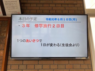 本日の予定です。3年生は修学旅行2日目です。3年生は居ませんが、今週も頑張っていきましょう。