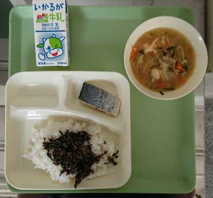 さごしの塩焼き、みそ汁、牛ひじきそぼろ、ご飯、牛乳となっています。