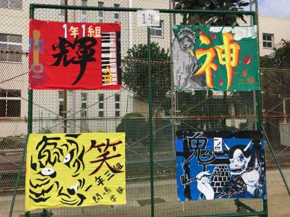 本日の学年集会で、学級旗の投票があります! 1年生の学級旗です。
