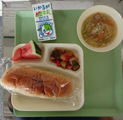 鶏肉と夏野菜のソテー、押麦のスープ、すいか、おさつパン、牛乳となっています。