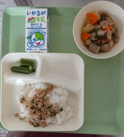 豚肉とじゃがいもの煮もの、オクラの甘酢あえ、ツナっ葉いため、ご飯、牛乳となっています。