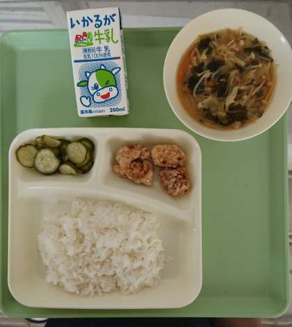 豚肉の香味あげ、みそ汁、きゅうりの甘酢づけ、ご飯、牛乳となっています。