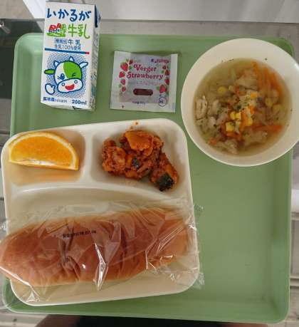 かぼちゃのミートグラタン、スープ、オレンジ、コッペパン、いちごジャム、牛乳となっています。