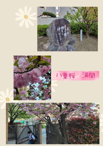 今、満開の八重桜の下を通り抜け、みんな時間に余裕を持って登校しています。