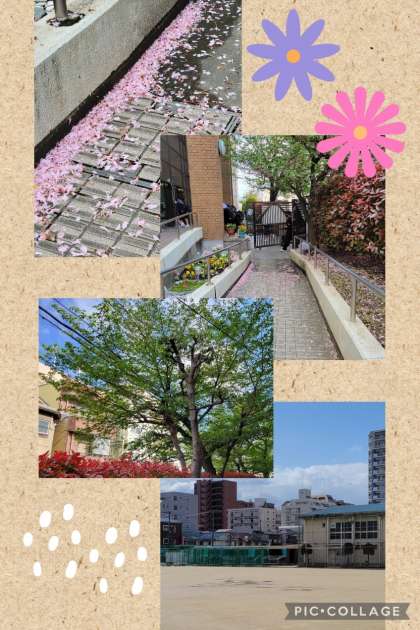 桜の花びらが散り、登校する生徒たちの足下をピンク色に染めています。