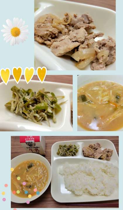 今日は『豚肉のしょうが焼き』と『じゃこピーマン』。しょうが汁で調理され豚肉の苦手な生徒でも美味しくいただけるのではないでしょうか。