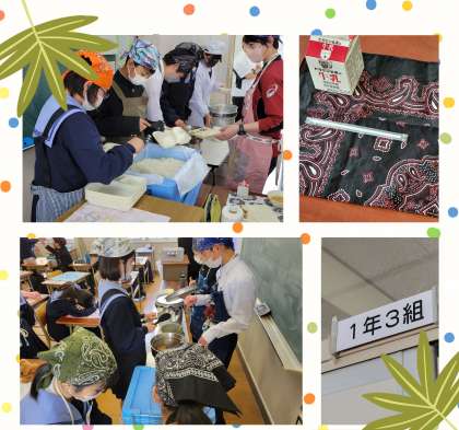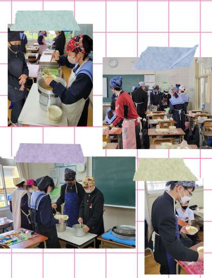 一年生教室、係り生徒が給食準備にあたっています。穏やかな教室で、係り生徒がたちが丁寧に食器によそっていきます。小学校での経験もあり、慣れたものです。