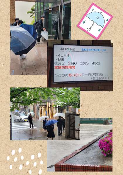 雨の日は雨を愛す 公開日 2023/04/26 更新日 2023/04/26 お知らせ 昨日から続く雨。ちょうど通勤と通学時間帯に激しく降る雨に気持ちが重たくなります。 小説家の吉川英治の言葉に『晴れた日は晴れを愛し、雨の日は雨を愛す。楽しみあるところに楽しみ、楽しみなきところに楽しむ』とあります。 環境や考え方次第で、見える風景は違ってきますよね。 それでも午後からはやっぱり晴れを期待します。 家庭訪問三日目、よろしくお願いします。 いいね(0)